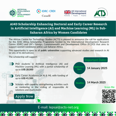 Le Centre africain d'études technologiques (ACTS) a reçu une subvention du Centre de recherches pour le développement international (CRDI) et du Foreign, Commonwealth and Development Office (FCDO) du Royaume-Uni pour soutenir les bourses d'études des candidates en Afrique subsaharienne. Le financement soutiendra la formation de doctorants en intelligence artificielle (IA) et en apprentissage automatique (AAM) ainsi que les travaux de recherche des universitaires en début de carrière en IA et en AAM. Les travaux de recherche dans le cadre de ce programme doivent porter sur l'intelligence artificielle et concerner l'un des objectifs de développement durable (ODD).