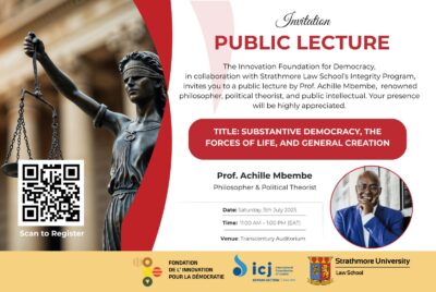 The Innovation Foundation for Democracy, in collaboration with Strathmore Law School’s Integrity Program, invites you to a public lecture by Prof. Achille Mbembe, renowned philosopher, political theorist, and public intellectual. Your presence will be highly appreciated.