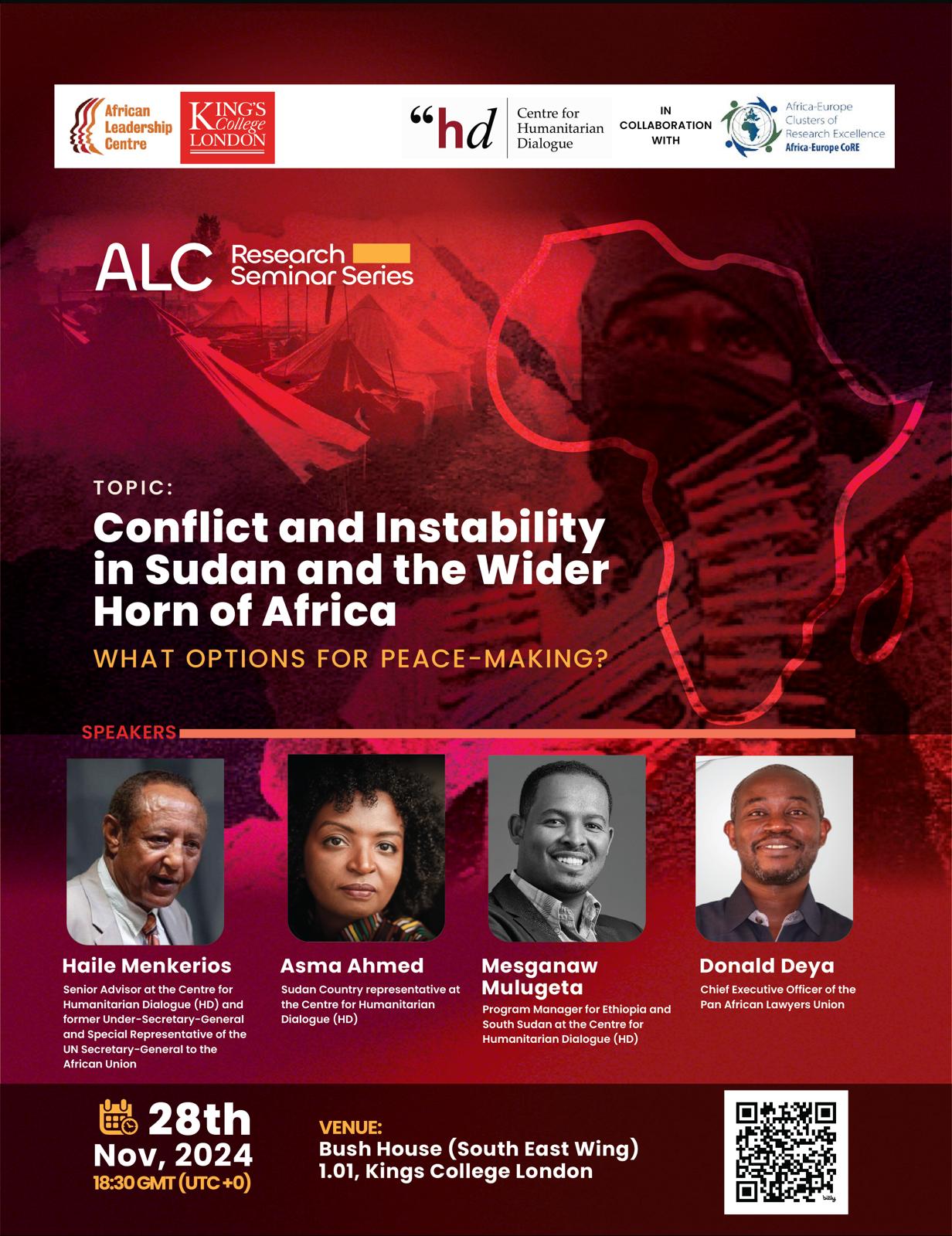 The African Leadership Centre (ALC) and The Centre for Humanitarian Dialogue (HD) would like to invite you to our upcoming ALC Research seminar series event, “Conflict and Instability in Sudan and the Wider Horn of Africa: What Options for Peace-making? ” It will be held on Thursday, 28 November 2024, from 18:30 UK Time.
